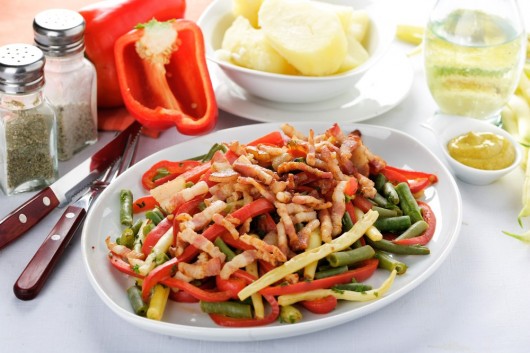 Pupeles susmulkinkite, apvirkite pasūdytame vandenyje, išgriebkite. Lašinukus supjaustykite plonais griežinėliais, paspirginkite, kol truputį parus. Kepimo riebalus sumaišykite su actu, garstyčiomis, cukrumi, druska, pipirais, raudonuoju vynu. Sudėkite smulkiai pjaustytus saldžiuosius pipirus, patroškinkite, kol suminkštės. Viską sumaišykite su pupelėmis. Patiekite su paspirgintais lašinukais ir virtomis bulvėmis, apibarstytomis kmynais.