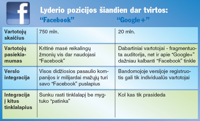 Kita vertus, net ir šiame kontekste “Facebook” situacija neatrodo beviltiška. Kad ir kaip įspūdingai skamba tie 20 mln. per tris savaites užsiregistravusiųjų “Google+”, šis skaičius yra 37 kartus mažesnis už bendrą “Facebook” vartotojų skaičių. Apie tokią infrastruktūrą ir verslo integraciją, kokią turi “Facebook”, “Google+” kol kas gali tik svajoti. Tačiau neabejotina, kad situacija keisis. “Facebook” šiuo metu atrodo kaip maratono bėgikas, nors ir pirmaujantis, bet pavargęs ir su plyštančiais bateliais. Tuo tarpu “Google+” – lig šiol nematyto pajėgumo sprinteris, kurio tempas sumažės, bet išliks stabiliai greitas. Jei sąlygos nepasikeis, tik laiko klausimas, kada jis pasivys konkurentą.