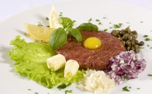 Jautienos išpjovą smulkiai sukapokite. Ant mėsos pilkite sojų padažo, berkite pipirų, druskos, išmaišykite ir padarykite apvalios formos kotletus su įdubimu viduryje. Į įdubimą įmuškite putpelės kiaušinį. Patiekite su smulkiai kapotais svogūnais, česnakais, kaparėliais. Viską apibarstykite kapotomis petražolėmis.Įdėkite pora skiltelių citrinos.