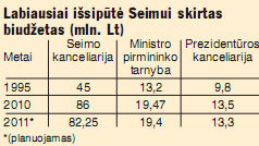 Priminsime, kad 2011 m. Seimo kanceliarijai planuojama skirti daugiau nei 82 mln. Lt, nors 1995 m. jai buvo atseikėta 45 mln. Lt. Nuo 1996-ųjų Seimo kanceliarijai išlaikyti skirta eilutė valstybės biudžete stabiliai ilgėjo, o labiausiai šoktelėjo į valdžią atėjus socialdemokratams: 2007 m. skirta 149 mln. Lt, o 2008 m. – 124,8 mln. Lt.