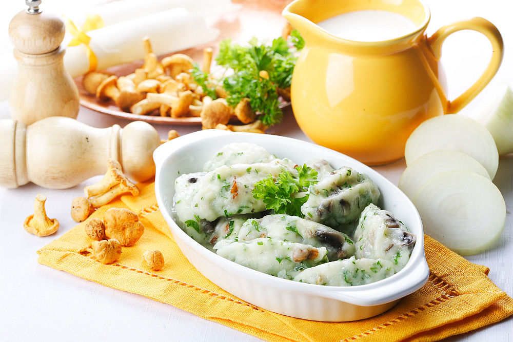 Bulves išvirkite ir sutrinkite, kol karštos. Sumaišykite su krakmolu, įberkite druskos, pipirų, pamažu supilkite karštą pieną. Grybus smulkiai sukapokite, svogūną supjaustykite, viską sumaišykite su bulvių mase. Padarykite pailgus kukulius ir virkite juos pasūdytame vandenyje 20 min. Išgriebkite ir iškart patiekite, papuošusi žalumynais.