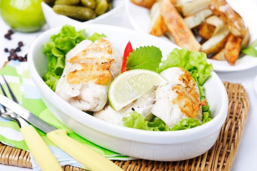 Žuvies filė supjaustykite nedidelėmis porcijomis, apibarstykite druska, pipirais, aptepkite tirpintu sviestu, apvoliokite trupiniuose, pašlakstykite sviestu ir kepkite ant grotelių po 3–4 min. iš abiejų pusių. Ant iškepusios žuvies gabalų uždėkite po citrinos griežinėlį. Atskirai patiekite keptas bulves, majonezą ir marinuotus agurkėlius.