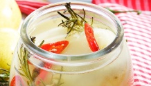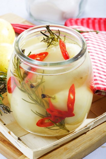 Kriaušes nulupkite. Odeles pavirkite su 2 stiklinėmis vandens. Jei kriaušės didelės – perpjaukite perpus. Suberkite cukrų, įdėkite vaniliną, kriaušes, aitriąją papriką ir virkite, kol kriaušės pasidarys skaidrios. Kriaušes su aitriąja paprika sudėkite į stiklainius, įdėkite rozmarino. Sirupą perkoškite. Įpilkite vandens su actu (santykiu 1:10). Šio skysčio turi būti tiek, kiek sirupo. Užvirinkite, užpilkite kriaušes, uždarykite.