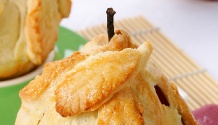 Paruoštą tešlą padalykite į 4 dalis. Iš kiekvieno gabaliuko iškočiokite 20 cm skersmens paplotėlius. Kriaušes nulupkite, atsargiai išskobkite sėklas, stengdamasi nenulaužti kotelio. Dubenėlyje sumaišykite kardamoną, cukrų, smulkiai pjaustytas slyvas arba abrikosus. Ant kiekvieno tešlos paplotėlio dėkite po kriaušę, aplinkui pridėkite paruošto mišinio. Tešla apvyniokite kriaušę, suspauskite, tešlos perteklių nugnybkite, padarykite lapelius ir prilipinkite prie kriaušės. Paruoštas kriaušes patepkite pienu, apibarstykite cukrumi, sudėkite į riebalais pateptą kepimo formą ir pašaukite į 200 laipsnių karštumo orkaitę, kepkite 30 min.