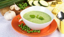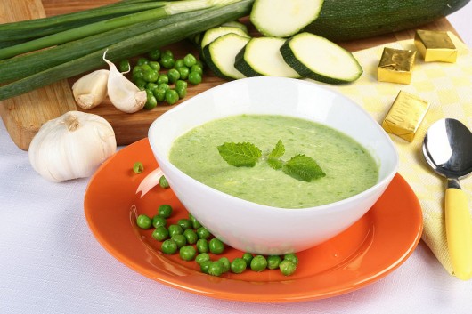 Įkaitintame puode ištirpinkite šaukštą sviesto. Suberkite svogūnus, česnaką bei rozmariną ir pakepinkite, kol svogūnai taps skaidrūs, o česnakas suminkštės. Suberkite cukinijas ir pakepinkite 5 min., kol suminkštės. Supilkite sultinį, suberkite žirnelius. Užvirinkite ir virkite 10 min. Sriubą atvėsinkite, išgriebkite rozmariną. Virtuviniu kombainus išplakite iki vientisos masės, perkoškite per sietelį. Jogurtą sumaišykite su smulkintomis mėtomis, perkoštą trintų daržovių masę sumaišykite su jogurtu. Sriubą patiekite atšaldytą, papuoškite mėtų lapeliais.