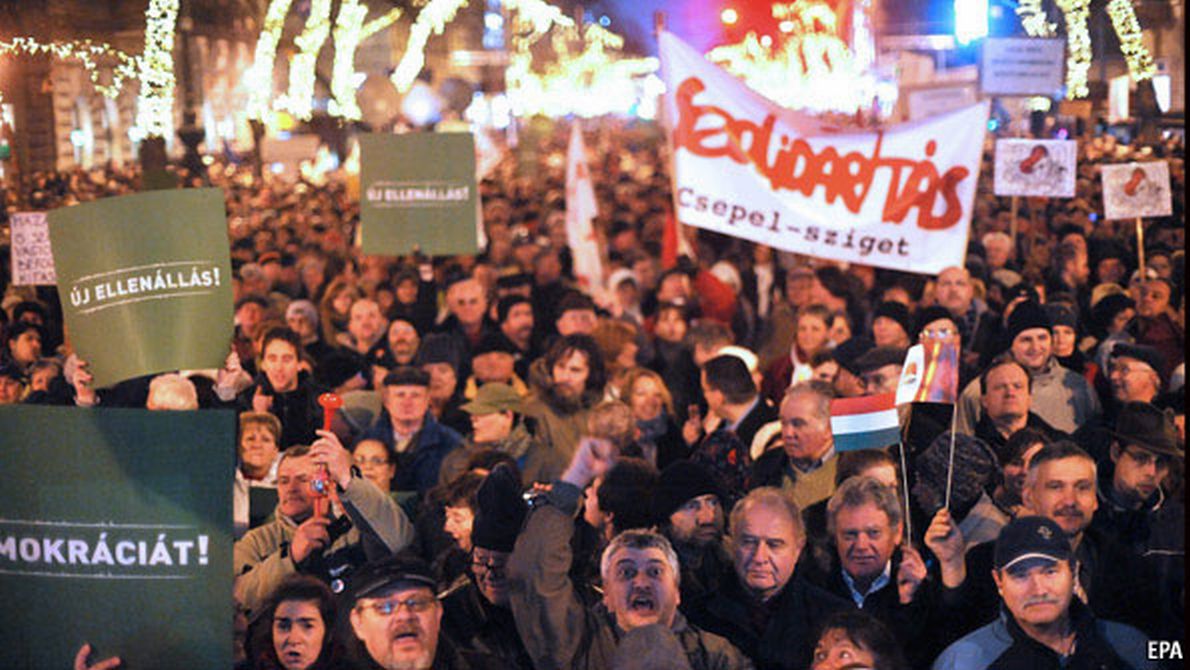 V.Putinui lankantis Budapešte, per 2 tūkst. protestuotojų susirinko į antirusišką protesto mitingą. „Pilietinių visuomenės grupių persekiojimas, korupcija ir oligarchų penėjimasis rodo, kad mes vis labiau artėjame prie Rusijos modelio ir tolstame nuo europietiškojo“, – sakė vienas mitingo organizatorių opozicionierius Gaboras Vago.
